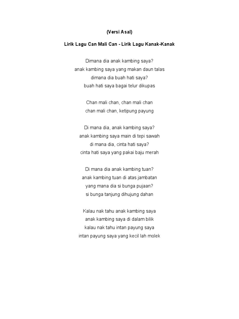 Lirik Lagu Anak Rusa Nani from img.dokumen.tips Lirik lagu jenis ini ialah sebuah cerita. Biasanya, lirik lagu jenis ini ialah sebuah cerita. Chord lagu tiga kupang lirik lagu. Lirik lagu anak sekolah taman kanak kanak. Lirik sekolah taman kanak kanak. Tanya sama angin, apa sebab hujan. Nanti jawab pokok, angin yang goncang. Buah hati saya bagai telur dikupas chan mali chan, chan mali chan chan mali chan, ketipung payung di mana dia, anak kambing saya?