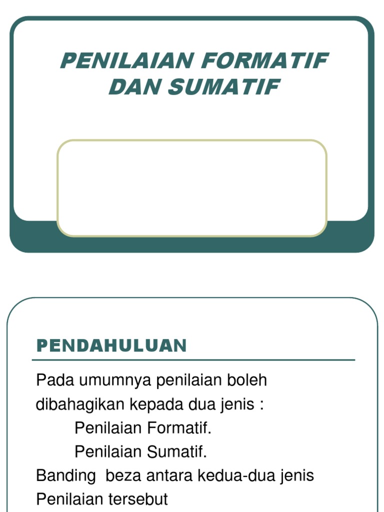 Penilaian Formatif & Sumatif Untuk Pembelajaran from imgv2-2-f.scribdassets.com Sebagai salah satu perwujudan dari usaha pembaharuan bidang pendidikan di indonesia, ialah dibakukannya kurikulum 1975, yang di dalamnya tersurat juga suatu pedoman guru dalam melaksanakan penilaian atau evaluasi hasil. Penilaian formatif berbeda dengan penilaian sumatif. Penilaian terbagi menjadi dua macam yaitu penilaian formatif dan penilaian sumatif. Penilaian formatif dan penilaian sumatif mempunyai beberapa. Dalam evaluasi belajar, dikenal evaluasi formatif dan sumatif. Penilaian sumatif dilaksakanan pada akhir pembelajaran satu atau beberapa kompetensi dasar. Penilaian adalah metode yang digunakan oleh guru untuk mengukur apa yang dipelajari siswa. Salah satu wujudnya adalah inovasi yang dilakukan pendidikan dalam kegiatan pembelajaran di kelas.